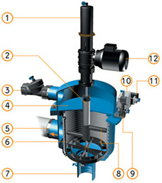 Kad razlika tlaka [ΔP] dosegne unaprijed postavljene vrijednosti na diferencijalnom tlakomjeru [11], pokrene se niz procesa u kojim voda dalje prolazi u dijelove sistema. Regulator prenosi signal za 5-sekundni ciklus ispiranja. Ventil za ispiranje [3] se otvori, od hidrauličnog klipa [1] se oslobodi tlak i voda ističe van. Tlak u hidrauličnoj komori [4] i hvataču nečistoća [2] prilično je smanjen što uzrokuje proces usisavanja preko usisnih sapnica [8] u hvatač nečistoća [2] a odavde do komore za ispiranje [4] i preko ventila za ispiranje [3] van. Istovremeno elektromotor [12] okreće hvatač nečistoća [2] oko njegove ose. Od klipa [1] se oslobodi tlak i ovako nastali visoki tlak unutar filtera daje hvataču nečistoća vertikalni pokret. Kombinacija ovog vertikalnog pokreta i rotacije učinkovito čisti površinu [6] unutarnjeg sita.